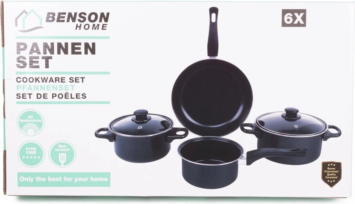 Wil jij een complete pannenset zodat je voor iedere maaltijd de juiste pan op de camping hebt staan? Kies dan voor deze complete pannenset van Benson! De pannen zijn geschikt voor alle warmtebronnen behalve open vuur en inductie. De pannen zijn gemaakt van 0.8 mm carbon staal en zijn voorzien van een volledig PTFE vrije antiaanbaklaag. Doordat de pannen in elkaar gestapeld kunnen worden nemen ze weinig opbergruimte in beslag.