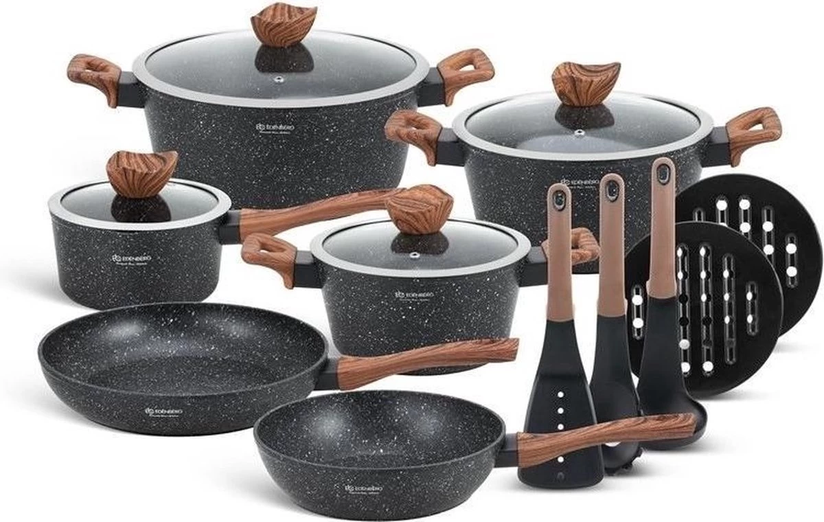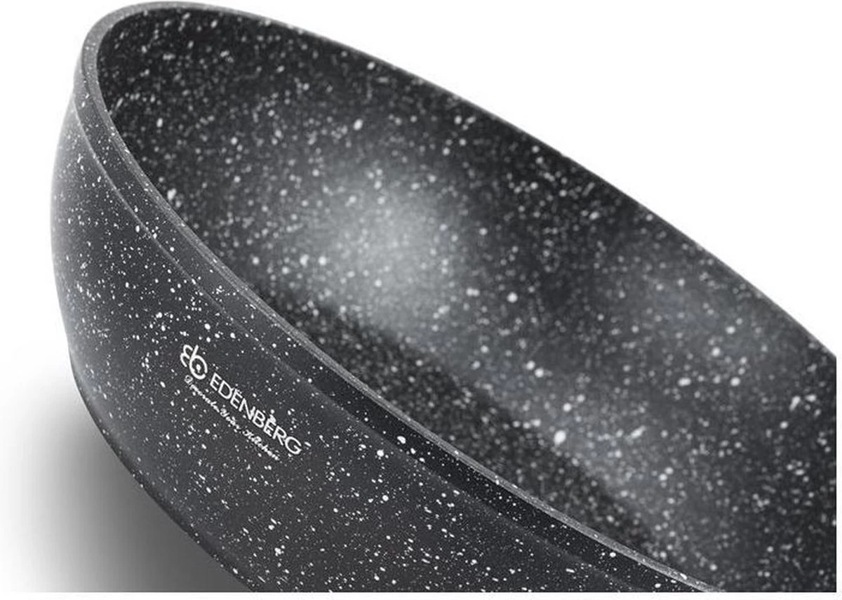 Deze prachtige pannenset van Edënbërg wordt geproduceerd onder de strengste Duitse normen en met het beste aluminium. De bodem is bedekt met maar liefst 3 lagen marmer met een mooie zwarte binnenkant die niet verkleurd. Dankzij de dikke bodem zijn de pannen zeer duurzaam en wordt het eten gelijkmatig verwarmd. De pannen kunnen worden gebruik op een kookplaat en ook op een fornuis met inductie.