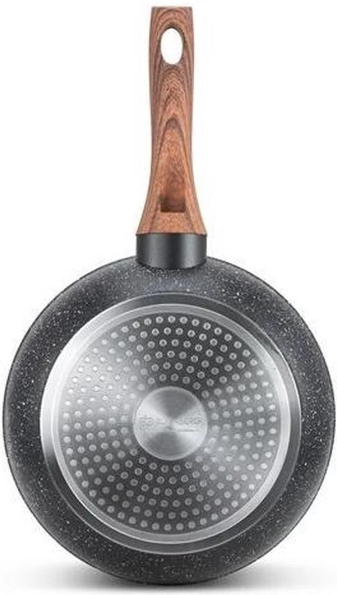 - Gegoten aluminium, met keramische/marmeren coating, ideaal voor aanbraden, en vetarm koken