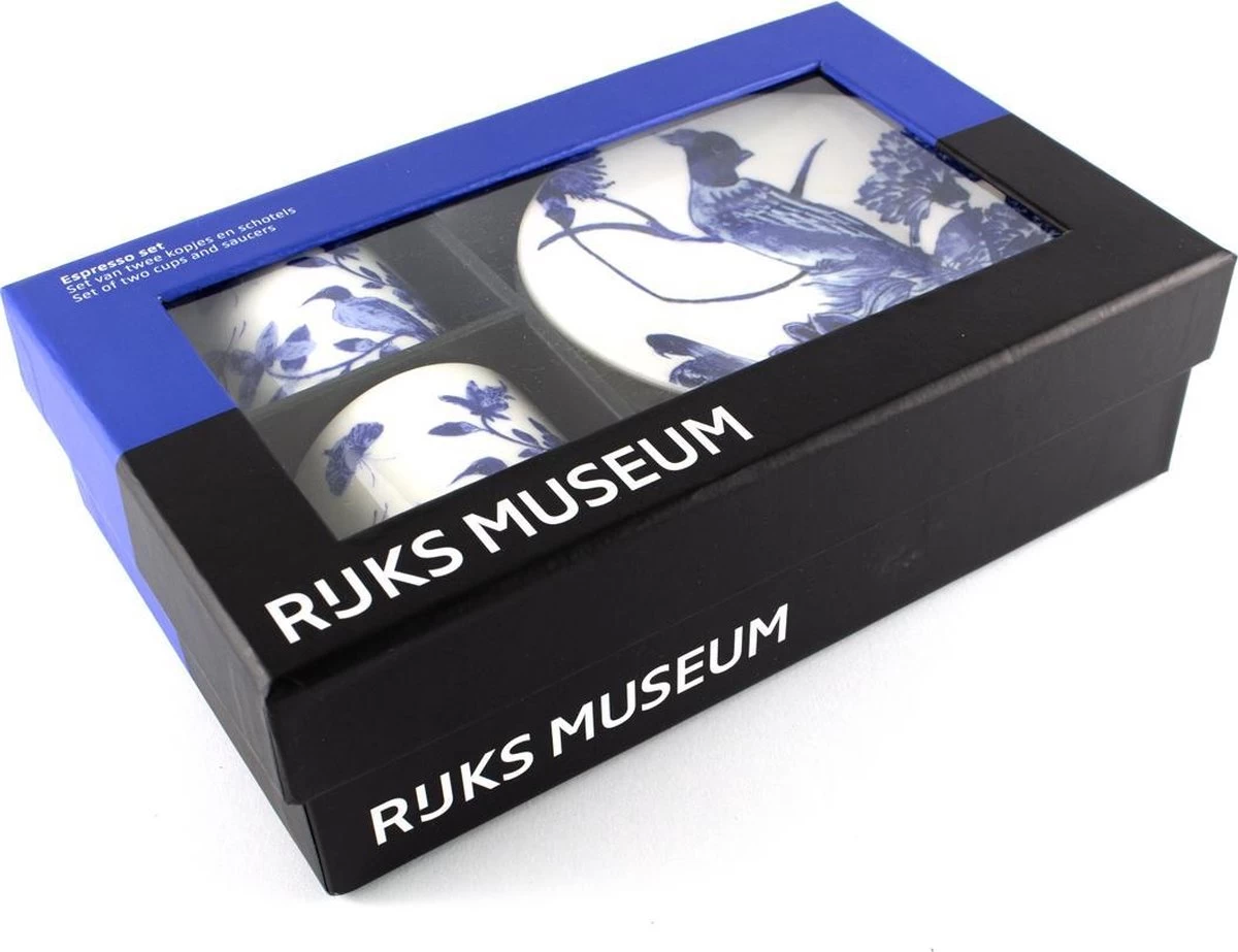 Een mooie gift set met 2 espresso kopjes met schoteltjes met een afbeeding van een Delfts Blauw Tegeltableau uit het Rijksmuseum.