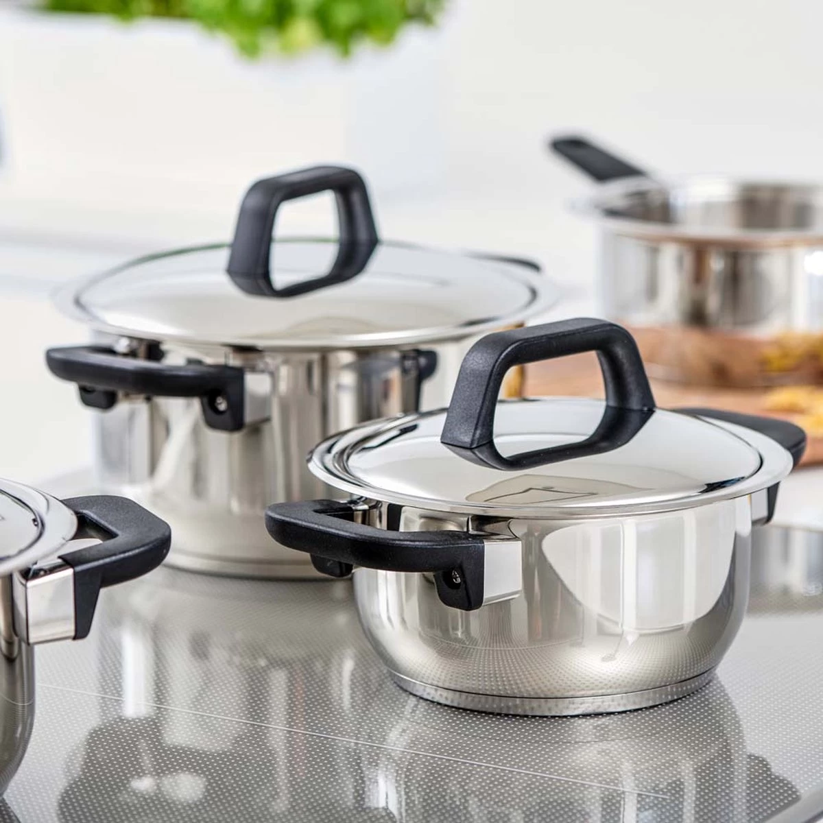 Deze PFAS-vrije Gero Erik RVS Kookpannenset – 4 delig staat stoer op het fornuis en op tafel. De combinatie van de hoogglans pannen en de zwarte kleur van de grepen geven de pannen een strak design. Met deze vier kookpannen heb je een goede basis voor jouw keuken.