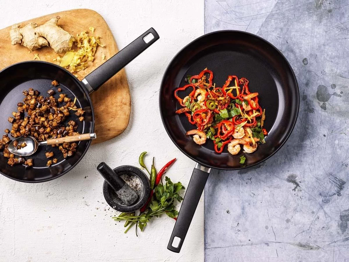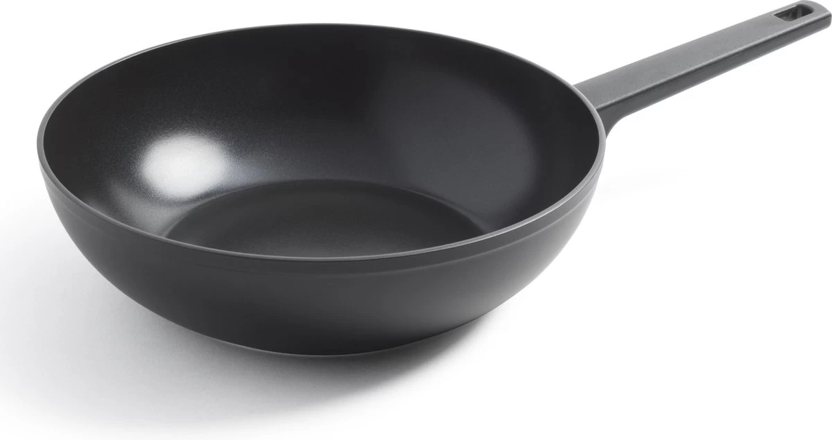 Deze PFAS-vrije Gero Erik Aluminium Wok – 28cm staat stoer op het fornuis en op tafel. De zwarte kleur van de pan en de grepen geeft deze pan een strak design. De keramische anti-aanbaklaag (PFAS-vrij) voorkomt aanbakken en je gerecht glijdt probleemloos uit de pan. Zo wordt koken leuker en makkelijker.