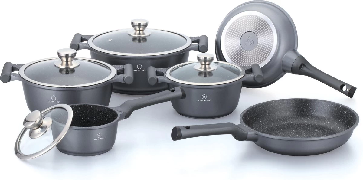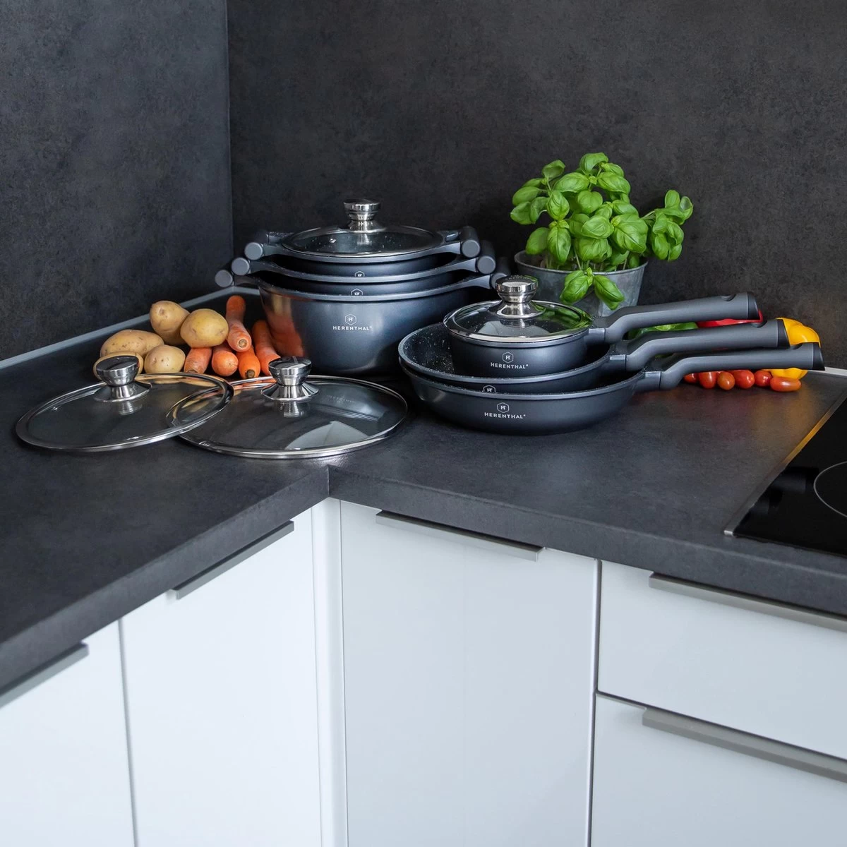 Herenthal Pannenset Inductie – Luxe 10-Delige Pannenset – Kookpotten Voor Alle Warmtebronnen – Kookpan – Pan Inductie Met Glazen Deksels En Koudgrepen – Grijs