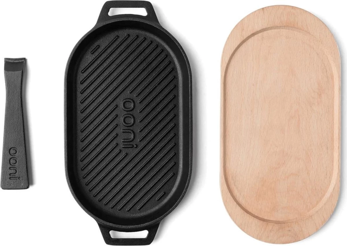 De Grizzler wordt geleverd met een verwijderbare gietijzeren handgreep zodat je de gerechten gemakkelijk in en uit de Ooni-oven kunt laden. De pan kun je direct uitserveren op de meegeleverde beukenhouten serveerplank. INCLUSIEF * Afneembaar gietijzeren handvat * Beukenhouten serveerplank Past deze Grizzler pan op jouw kamado? De Gietijzeren Grizzlerpan van Ooni heeft een lengte van 31cm. Daardoor past hij niet op de Big Green Egg mini, verder past hij op alle kamado’s die een grillrooster hebben groter dan 33cm. De gietijzeren Grizzlerpan is ook geschikt voor alle Ooni pizzaovens.