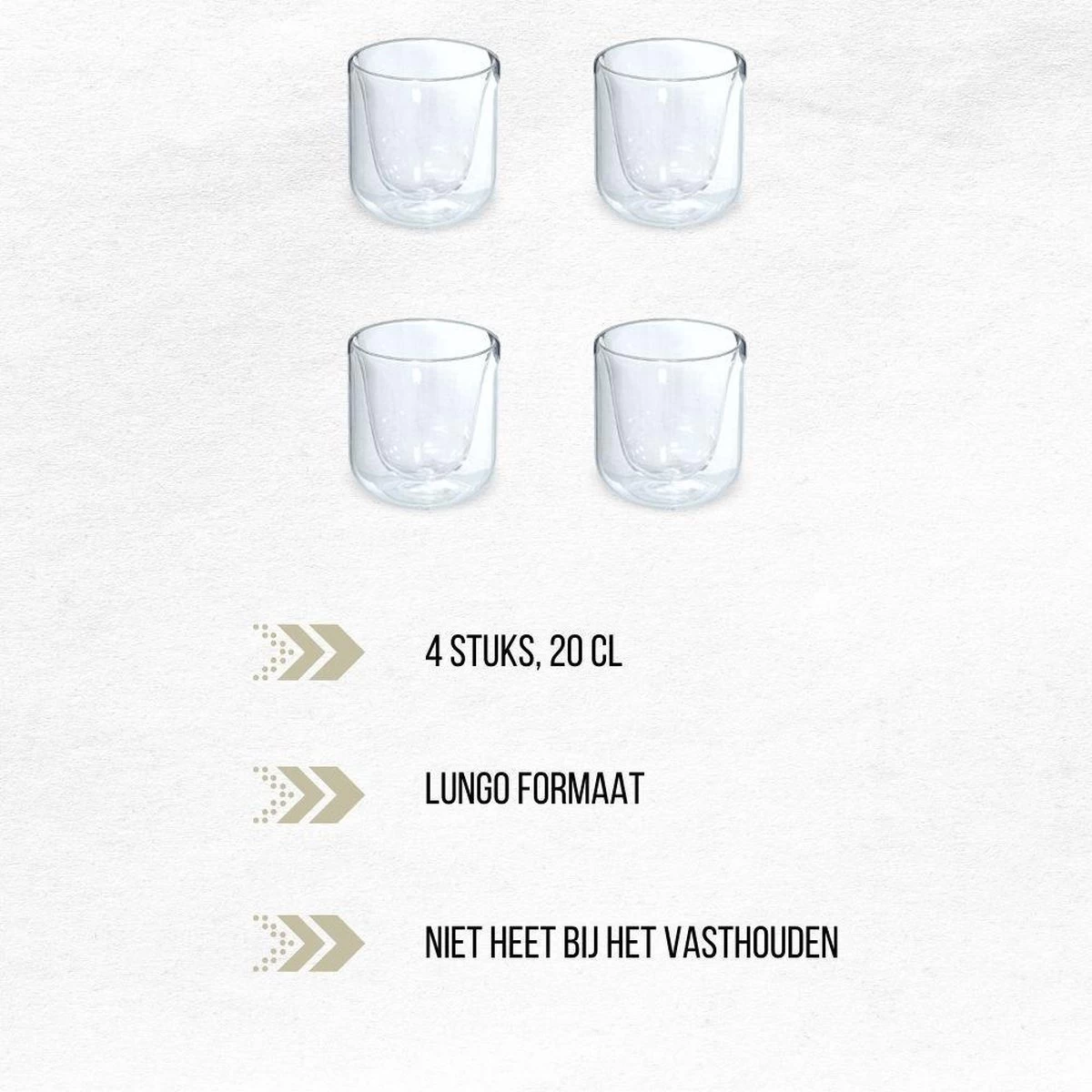 Deze dubbelwandige glazen 200 ml hebben het perfecte formaat voor een lekkere kop lungo koffie. Dubbelwandig glas is in staat om jouw koffie op de gewenste temperatuur te houden. Hierdoor blijft de binnenkant goed warm, terwijl de buitenkant juist koel blijft. De glazen hebben een modern uiterlijk en zijn daarmee een mooie aanvulling van je serviesgoed. De glazen worden geleverd in een set van 4.