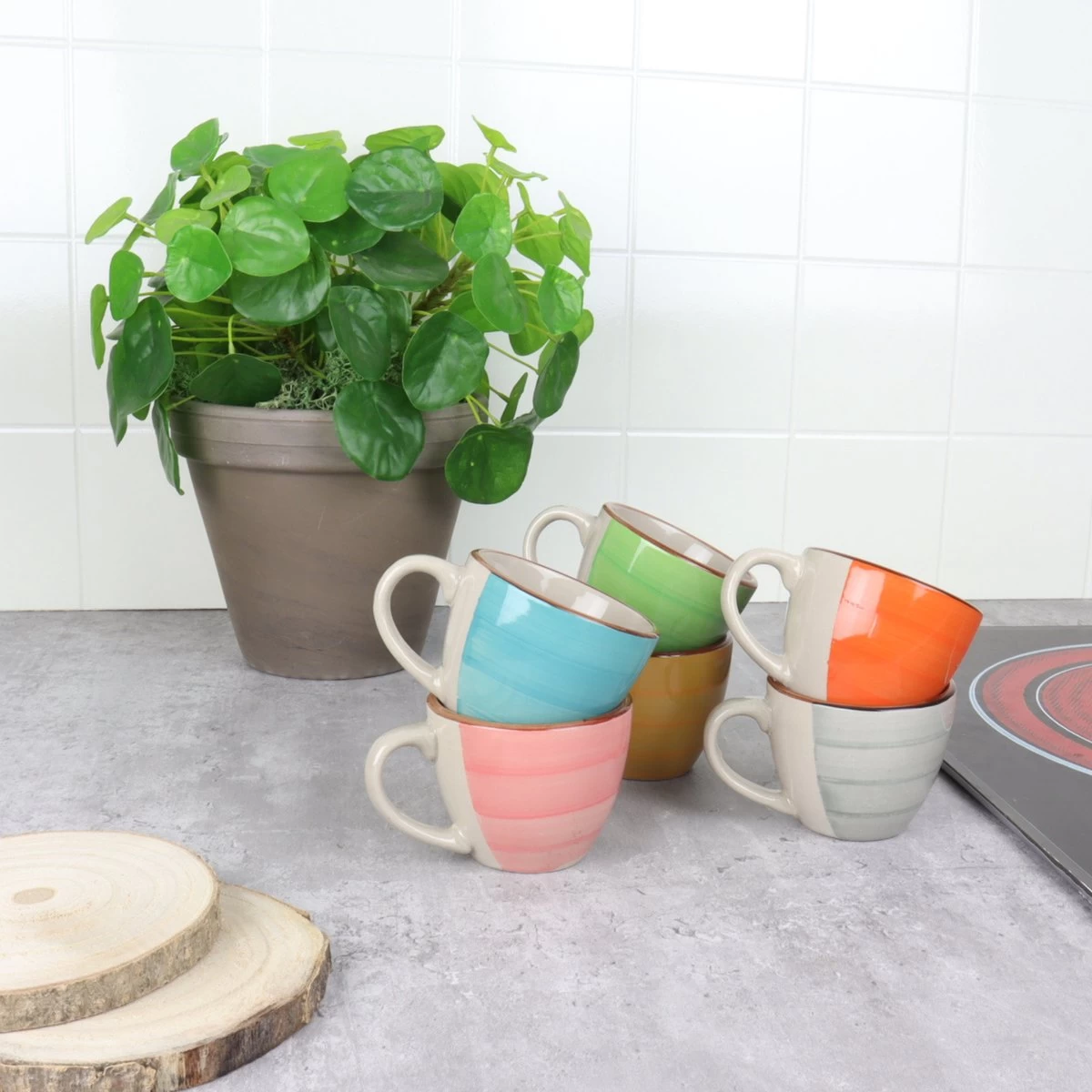 Zes espresso kopjes van Orange85. De set is gemaakt van aardewerk en de kopjes hebben allemaal een verschillende kleur. De kopjes zijn ideaal om espresso’s uit te drinken. De kopjes hebben een inhoud van 90 ML. De kopjes zijn van klein formaat.