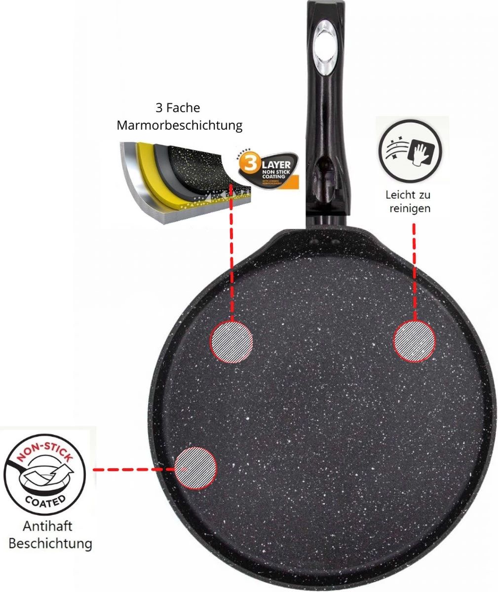 Met deze pannenkoekenpan maak je de heerlijkste pannenkoeken. De pan heeft een 3-lagen marmeren coating. Het kan worden gebruikt op alle soorten warmtebronnen.