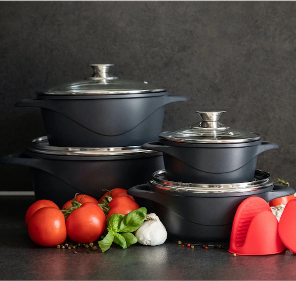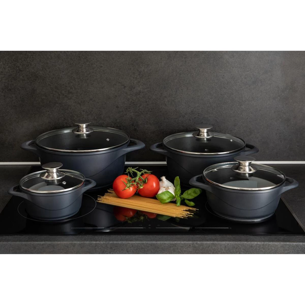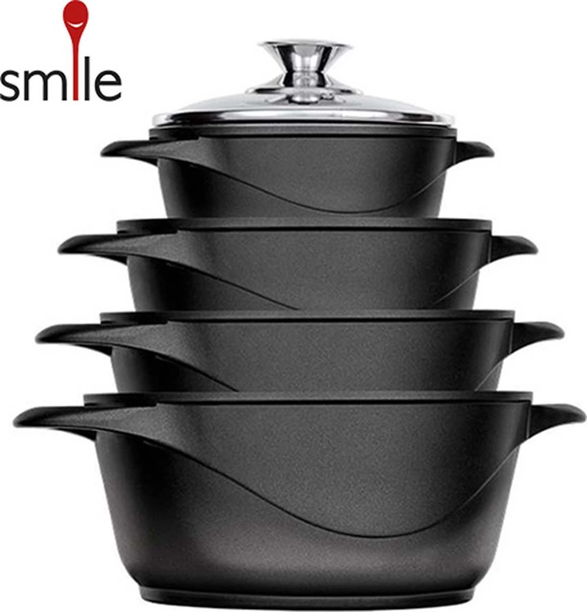 Deze prachtige pannenset van het merk Smile geeft iedere keuken een upgrade. De pannen zijn namelijk geschikt voor iedere kookplaat, waaronder inductie, gas en elektrisch. Ook wanneer jij switcht van huis of keuken kun jij deze pannen dus gewoon blijven gebruiken. Het zwarte materiaal en de glazen deksels zorgen voor een luxe en stijlvolle uitstraling, welke kleur jouw keuken ook is. Naast het mooie uiterlijk zijn de pannen ook nog eens van topkwaliteit; ze zijn allen voorzien van een anti-aanbaklaag, roestvrij stalen knoppen en dikke wanden voor een gelijkmatige warmteverdeling. De perfecte pannenset dus om in te koken, frituren, stoven óf braden.