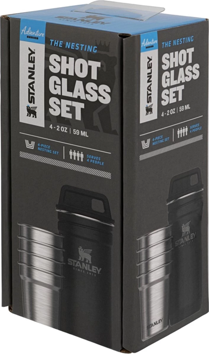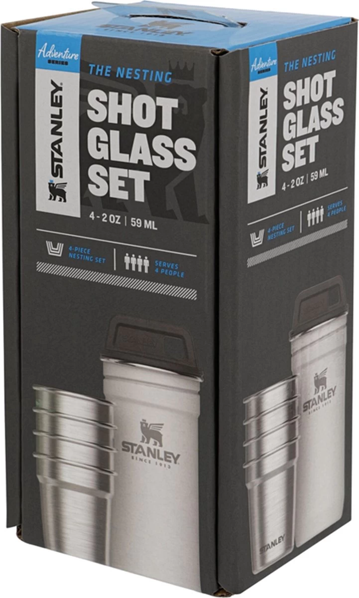 SHOTJE VOOR ONDERWEG: Stanley ontwierp deze 4 shotglazen voor een pre-party onderweg. De perfecte metgezel voor al je binnen- en buitenshuis avonturen. Ook leuk om als cadeau te geven.